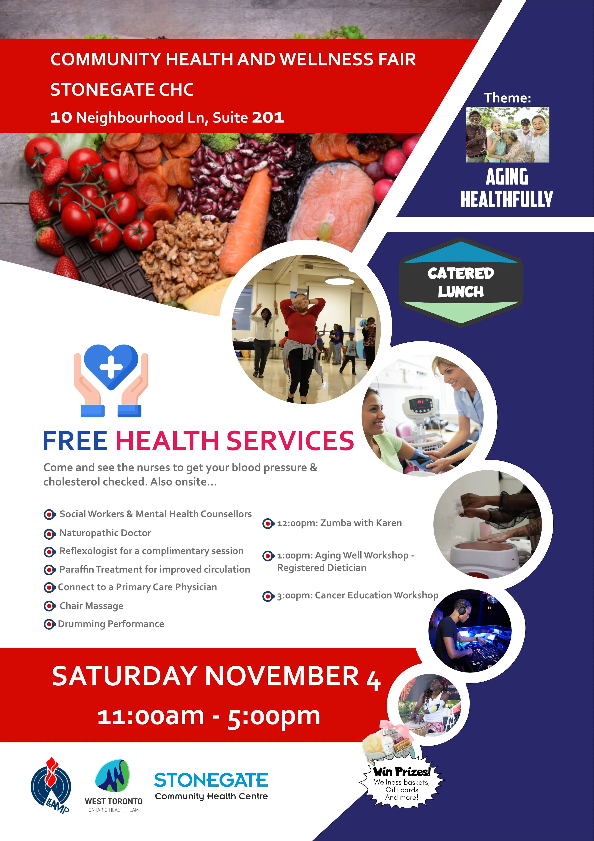 If you are an older adult and would like information on local services, join LAMP Community Health Centre, Stonegate Community Health Centre, and the West Toronto Ontario Health Team as we a community health and wellness fair on Sat. Nov. 4, 2023.